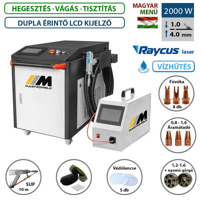 A MASTRO LASER 2000 egy lézerhegsztő / vágó / tisztító berendezés vízhűtővel és külön előtolóval rendelkező egység 10 méteres lézerszálas SUP 23T pisztollyal.