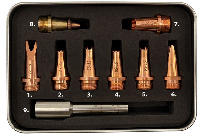 - 8 típusú fúvóka, amelyek támogatják a lapos szöget, a külső szöget, a belső szögű hegesztést és vágást